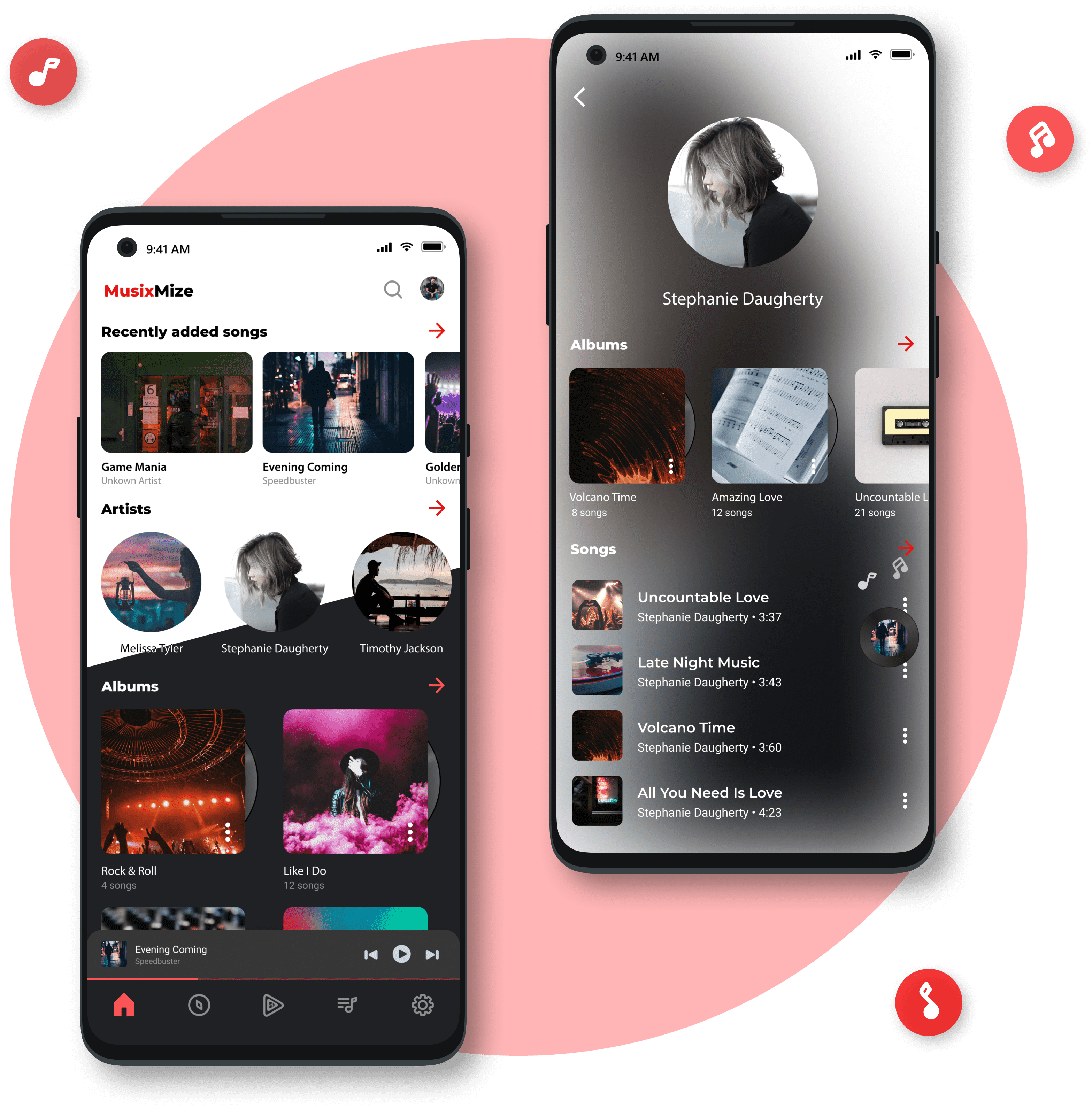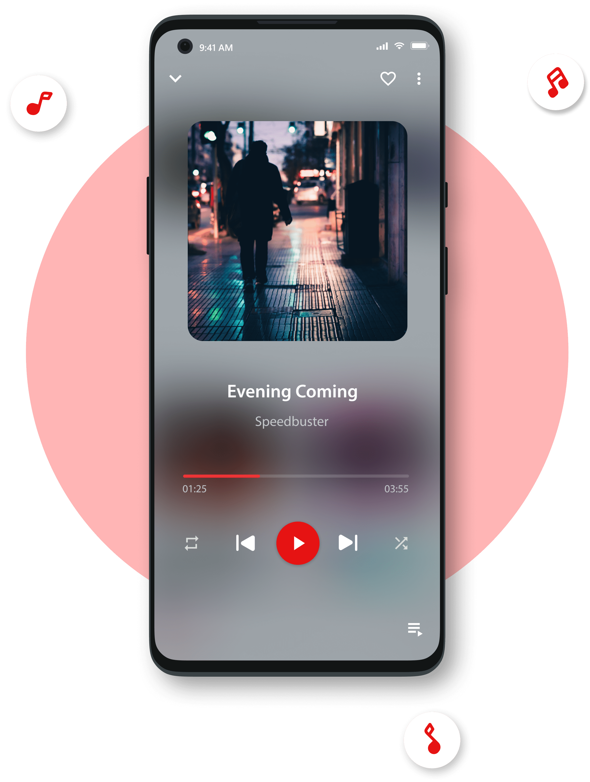 In our app, you can listen music from our smart playlists features and customize now playling screen with themes that are available now.
