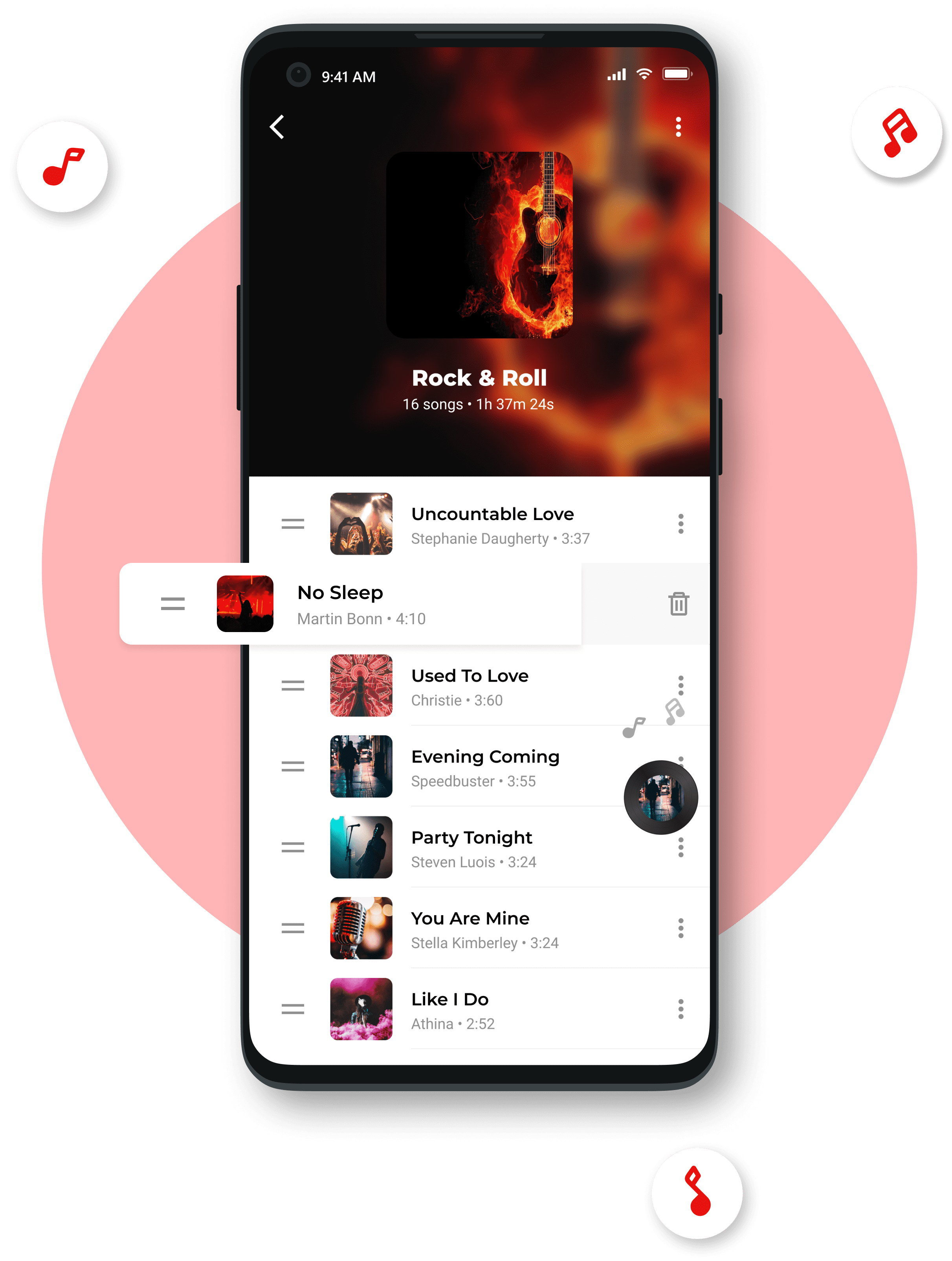You can easily reoder your music with drag & drop feature and also swipe to delete music. These will help you easily organized your playlists.